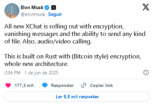 - Elon Musk anunciou o XChat, novo serviço de mensagens criptografadas, disponível para alguns usuários do X nesta semana.