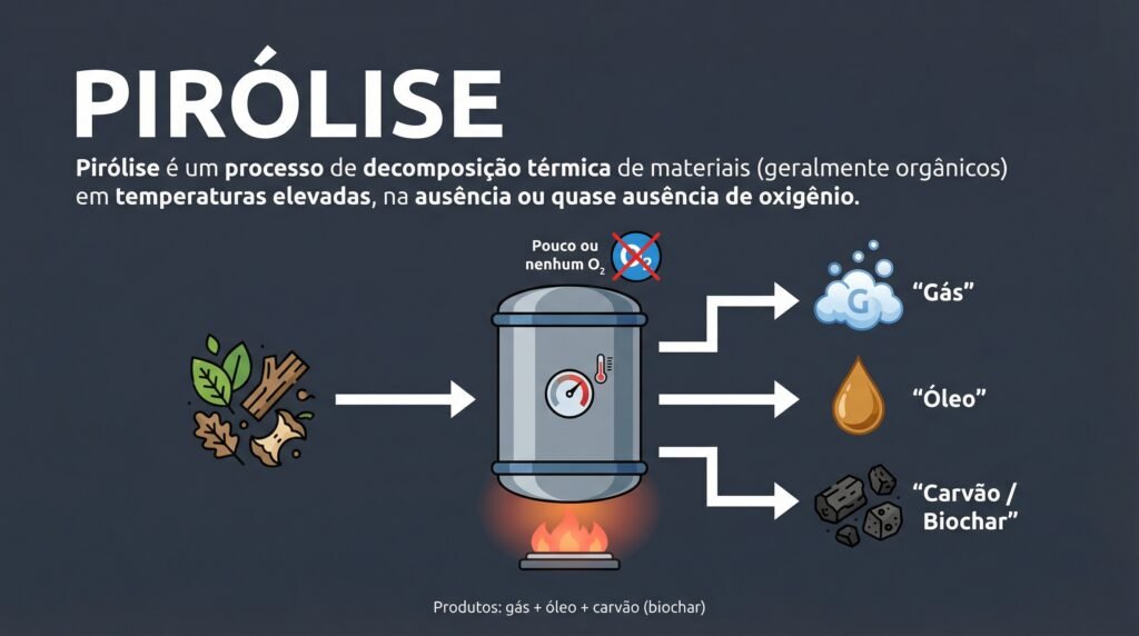 - Pirólise: Processo que aquece materiais sem oxigênio para transformá-los em gás, óleo e carvão.
