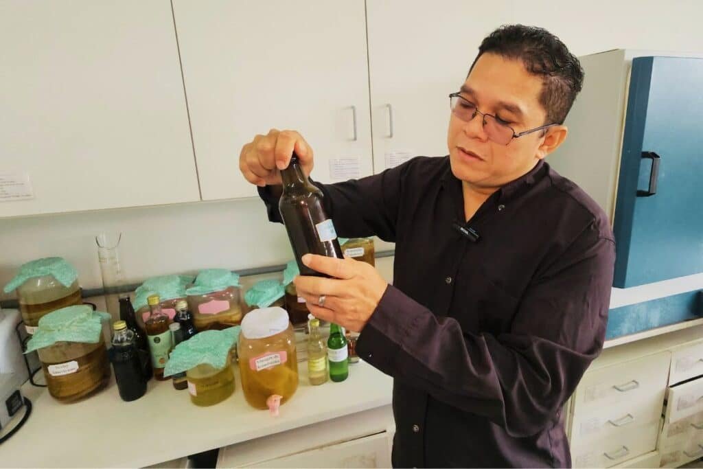 Outra faceta da produção científica de Wenderson envolve a kombucha, bebida fermentada à base de chá, que ganhou popularidade durante a pandemia. No olhar do pesquisador, o mais interessante não era apenas a bebida, mas a camada de celulose bacteriana que se forma durante a fermentação.