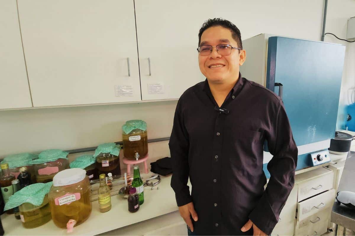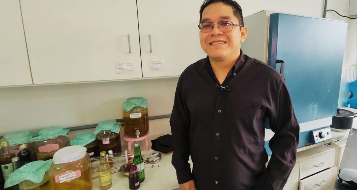 Outra faceta da produção científica de Wenderson envolve a kombucha, bebida fermentada à base de chá, que ganhou popularidade durante a pandemia. No olhar do pesquisador, o mais interessante não era apenas a bebida, mas a camada de celulose bacteriana que se forma durante a fermentação.